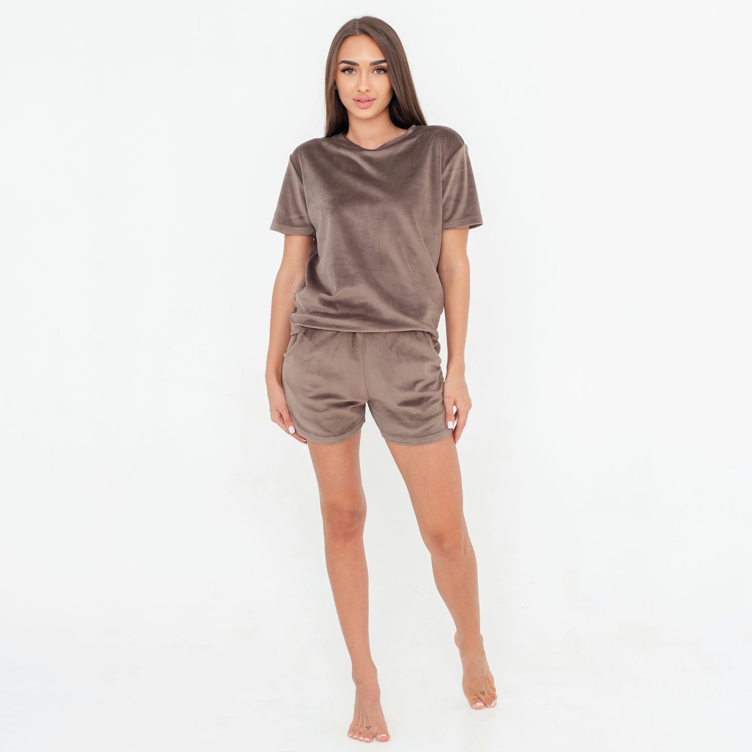 Стильний домашній костюм AURA – затишний і стильний домашній костюм. AURA – це втілення комфорту та елегантності в одному комплекті. М’який, приємний на дотик велюр створює відчуття ніжності на шкірі, забезпечуючи максимальний комфорт для сну та відпочинку. Комплектація домашнього одягу AURA: Майка з короткими рукавами – стильний крій, що красиво сідає по фігурі, дозволяючи відчувати себе впевнено та комфортно. Вільні шорти на гумці – забезпечують свободу рухів і зручну посадку без тиску. Переваги жіночого костюму AURA: М’який велюр – приємний на дотик, зігріває у прохолодні вечори, дарує відчуття затишку. Комфортна посадка – не сковує рухи, ідеально підходить для сну та відпочинку. Дихаюча тканина – добре пропускає повітря, зберігаючи приємний мікроклімат для тіла. Жіночний дизайн – ніжний, але водночас стильний вигляд. Практичність – легко переться, не втрачає форму та колір навіть після численних прань. Ідеальний варіант для подарунка – стильна та універсальна піжама, яка сподобається кожній жінці. Підходить не лише для сну – цей комплект чудово виглядає як домашній костюм для комфортного відпочинку. Ідеально для: Домашнього затишку – м’яка тканина дарує тепло та комфорт. Зимових та осінніх ночей – велюр приємно огортає, створюючи відчуття ніжності. Легких прогулянок удома або на відпочинку – стильний дизайн дозволяє носити комплект не тільки для сну. Подарунка для жінки – чудовий вибір для коханої, подруги чи сестри. Догляд за жіночим костюмом для дому AURA: Делікатне прання при 30°C. Уникати агресивних мийних засобів. Не використовувати віджим на високих оборотах. AURA – м'якість, стиль і комфорт у кожному дотику!