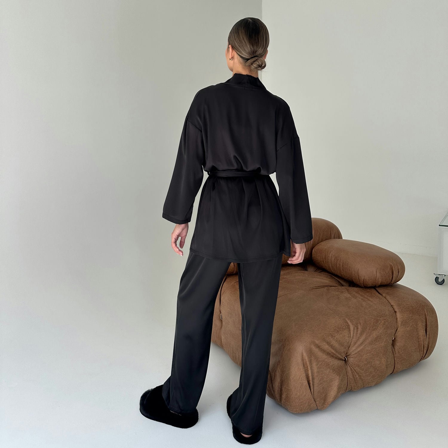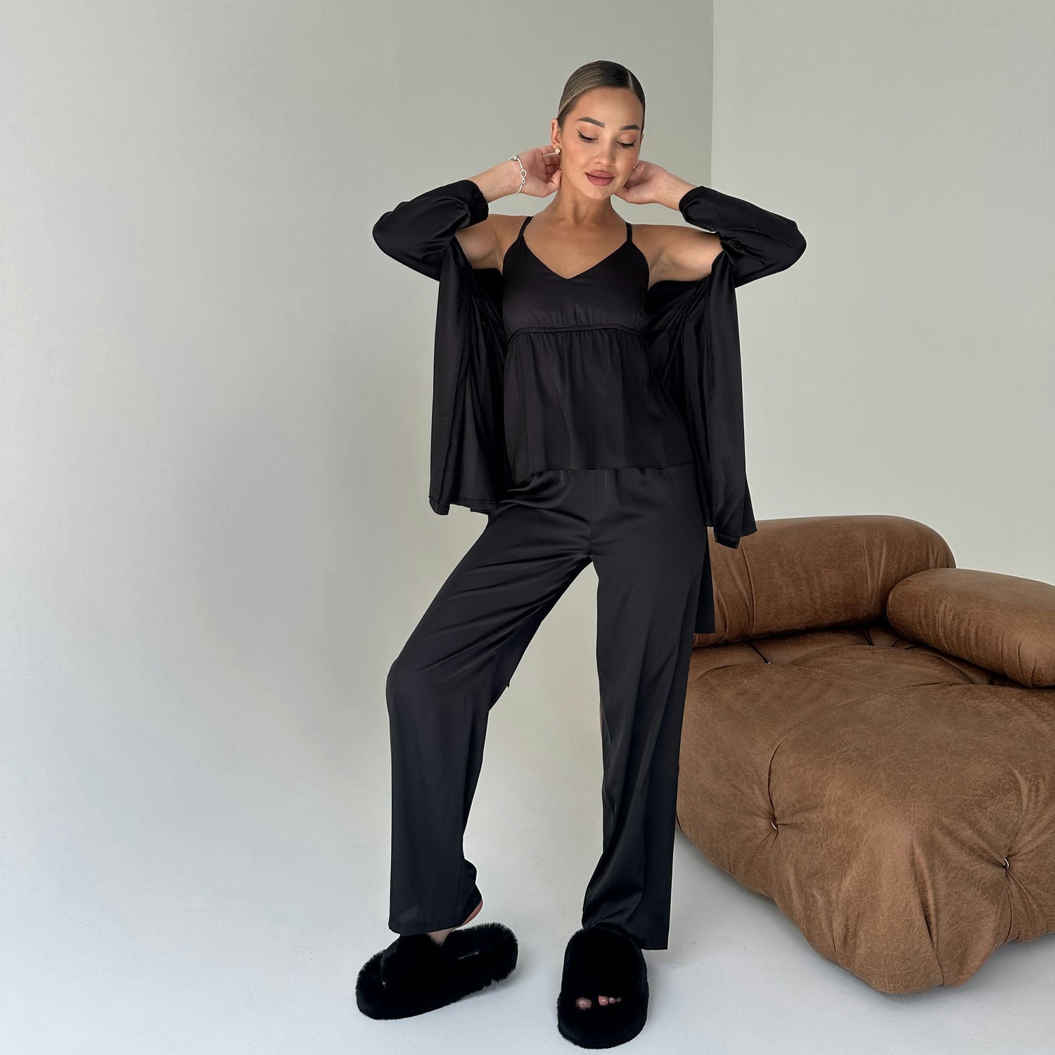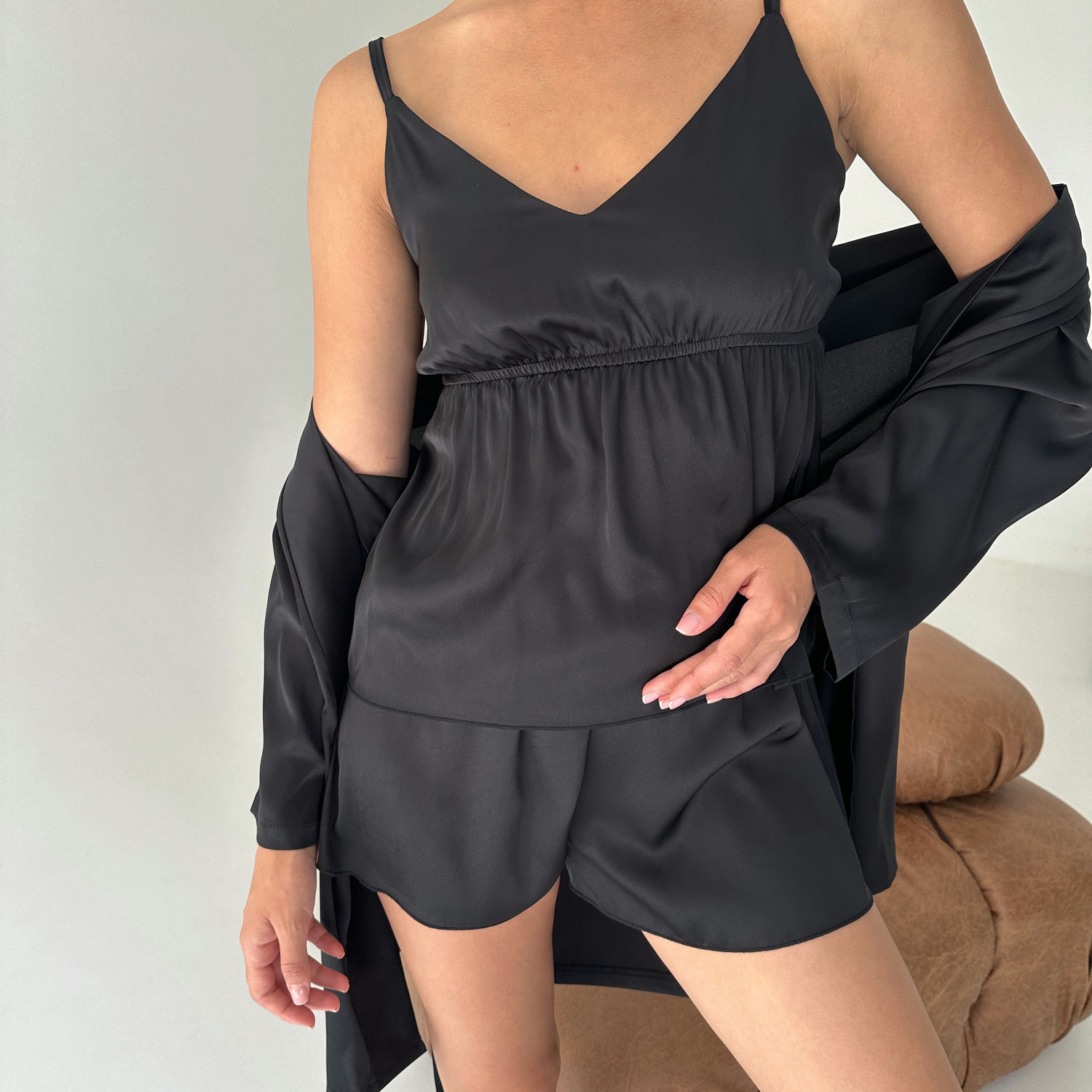 Жіночий комплект домашнього одягу Olympia: розкіш і комфорт у кожній деталі! Комплект Olympia – це вишуканий вибір для жінок, які цінують елегантність і комфорт. Домашній комплект складається з чотирьох елементів: шовкового халата, майки, шортів та довгих штанів. Кожна деталь цього комплекту створена для того, щоб ви відчували себе особливою навіть вдома. Переваги жіночого шовкового комплекту Olympia: Шовкова розкіш: Виготовлений з високоякісного шовку, який забезпечує неймовірну м'якість і гладкість на шкірі. Універсальність: Чотири елементи комплекту дозволяють створювати різноманітні образи для будь-якого випадку – від романтичного вечора до ранкової йоги. Комфорт: Легкий і повітряний шовк забезпечує максимальний комфорт, дозволяючи шкірі дихати. Стильний дизайн: Елегантний крій і вишуканий дизайн додають шарму та жіночності. Довговічність: Якісний шовк і міцні шви гарантують довгий термін служби комплекту. Гіпоалергенність: Шовк не викликає алергічних реакцій. Легкість у догляді: Шовк легко прати і швидко сохне. Що входить у комплект: Шовковий халат: елегантний фасон довжиною 75 см, що додає витонченості. Шовкова майка: на регульованих тонких бретелях, забезпечує ідеальну посадку. Шовкові шортики: на комфортній резинці, не стискають рухів. Шовкові штани: довжиною 101 см, стильний варіант для прохолодніших вечорів. Для кого підходить комплект Olympia? Для жінок, які цінують елегантність і розкіш у домашньому одязі. Для тих, хто шукає універсальний комплект для дому, сну та відпочинку. Для любительок ніжної білизни та шовку. Для тих, хто хоче відчувати себе особливою кожного дня. Для подарунка – цей комплект стане чудовим вибором для коханої, мами чи подруги. Як доглядати за жіночим комплектом Olympia? Прати вручну або в делікатному режимі при температурі до 30°C, використовуючи м’який засіб. Сушити на свіжому повітрі, уникаючи прямого сонячного проміння. Прасувати з вивороту при низькій температурі, щоб зберегти ніжність шовку. Придбати стильний жіночий домашній костюм можна в інтернет-магазині COSAS з доставкою по всій Україні. Жіночий домашній комплект Olympia – це інвестиція в ваш комфорт і красу. Відчуйте справжню ніжність шовку та додайте краплину розкоші у ваші будні.