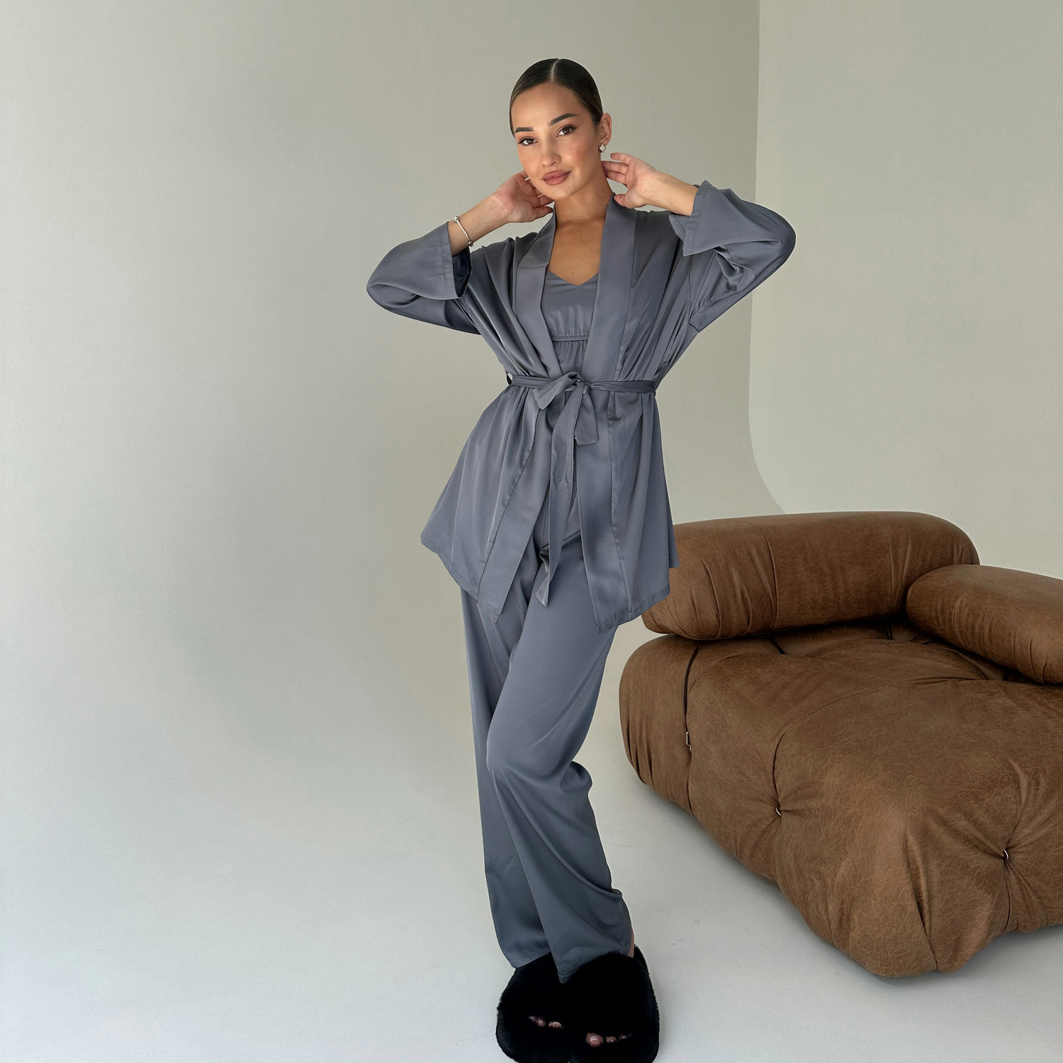 Жіночий комплект домашнього одягу Olympia: розкіш і комфорт у кожній деталі! Комплект Olympia – це вишуканий вибір для жінок, які цінують елегантність і комфорт. Домашній комплект складається з чотирьох елементів: шовкового халата, майки, шортів та довгих штанів. Кожна деталь цього комплекту створена для того, щоб ви відчували себе особливою навіть вдома. Переваги жіночого шовкового комплекту Olympia: Шовкова розкіш: Виготовлений з високоякісного шовку, який забезпечує неймовірну м'якість і гладкість на шкірі. Універсальність: Чотири елементи комплекту дозволяють створювати різноманітні образи для будь-якого випадку – від романтичного вечора до ранкової йоги. Комфорт: Легкий і повітряний шовк забезпечує максимальний комфорт, дозволяючи шкірі дихати. Стильний дизайн: Елегантний крій і вишуканий дизайн додають шарму та жіночності. Довговічність: Якісний шовк і міцні шви гарантують довгий термін служби комплекту. Гіпоалергенність: Шовк не викликає алергічних реакцій. Легкість у догляді: Шовк легко прати і швидко сохне. Що входить у комплект: Шовковий халат: елегантний фасон довжиною 75 см, що додає витонченості. Шовкова майка: на регульованих тонких бретелях, забезпечує ідеальну посадку. Шовкові шортики: на комфортній резинці, не стискають рухів. Шовкові штани: довжиною 101 см, стильний варіант для прохолодніших вечорів. Для кого підходить комплект Olympia? Для жінок, які цінують елегантність і розкіш у домашньому одязі. Для тих, хто шукає універсальний комплект для дому, сну та відпочинку. Для любительок ніжної білизни та шовку. Для тих, хто хоче відчувати себе особливою кожного дня. Для подарунка – цей комплект стане чудовим вибором для коханої, мами чи подруги. Як доглядати за жіночим комплектом Olympia? Прати вручну або в делікатному режимі при температурі до 30°C, використовуючи м’який засіб. Сушити на свіжому повітрі, уникаючи прямого сонячного проміння. Прасувати з вивороту при низькій температурі, щоб зберегти ніжність шовку. Придбати стильний жіночий домашній костюм можна в інтернет-магазині COSAS з доставкою по всій Україні. Жіночий домашній комплект Olympia – це інвестиція в ваш комфорт і красу. Відчуйте справжню ніжність шовку та додайте краплину розкоші у ваші будні.