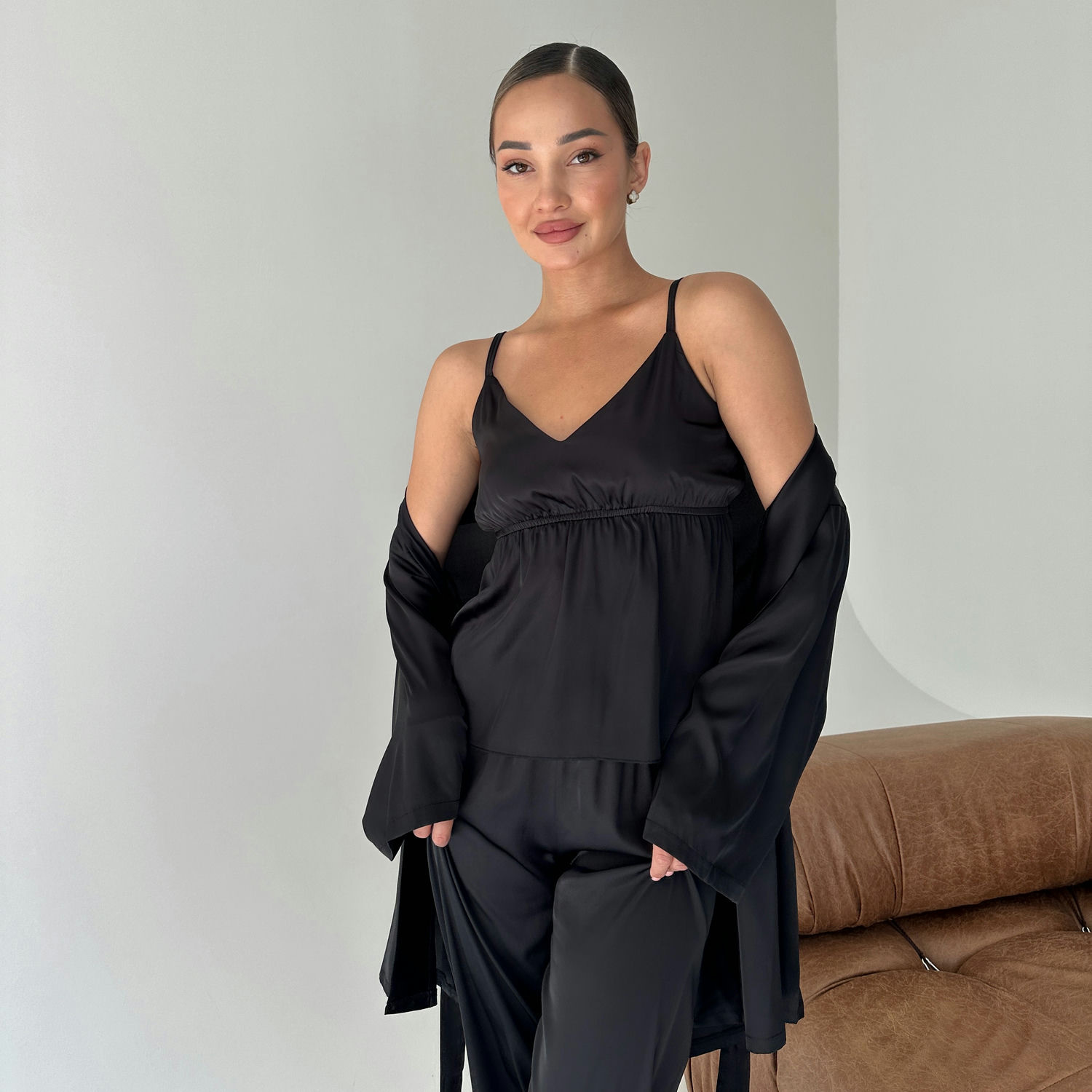 Жіночий комплект домашнього одягу Olympia: розкіш і комфорт у кожній деталі! Комплект Olympia – це вишуканий вибір для жінок, які цінують елегантність і комфорт. Домашній комплект складається з чотирьох елементів: шовкового халата, майки, шортів та довгих штанів. Кожна деталь цього комплекту створена для того, щоб ви відчували себе особливою навіть вдома. Переваги жіночого шовкового комплекту Olympia: Шовкова розкіш: Виготовлений з високоякісного шовку, який забезпечує неймовірну м'якість і гладкість на шкірі. Універсальність: Чотири елементи комплекту дозволяють створювати різноманітні образи для будь-якого випадку – від романтичного вечора до ранкової йоги. Комфорт: Легкий і повітряний шовк забезпечує максимальний комфорт, дозволяючи шкірі дихати. Стильний дизайн: Елегантний крій і вишуканий дизайн додають шарму та жіночності. Довговічність: Якісний шовк і міцні шви гарантують довгий термін служби комплекту. Гіпоалергенність: Шовк не викликає алергічних реакцій. Легкість у догляді: Шовк легко прати і швидко сохне. Що входить у комплект: Шовковий халат: елегантний фасон довжиною 75 см, що додає витонченості. Шовкова майка: на регульованих тонких бретелях, забезпечує ідеальну посадку. Шовкові шортики: на комфортній резинці, не стискають рухів. Шовкові штани: довжиною 101 см, стильний варіант для прохолодніших вечорів. Для кого підходить комплект Olympia? Для жінок, які цінують елегантність і розкіш у домашньому одязі. Для тих, хто шукає універсальний комплект для дому, сну та відпочинку. Для любительок ніжної білизни та шовку. Для тих, хто хоче відчувати себе особливою кожного дня. Для подарунка – цей комплект стане чудовим вибором для коханої, мами чи подруги. Як доглядати за жіночим комплектом Olympia? Прати вручну або в делікатному режимі при температурі до 30°C, використовуючи м’який засіб. Сушити на свіжому повітрі, уникаючи прямого сонячного проміння. Прасувати з вивороту при низькій температурі, щоб зберегти ніжність шовку. Придбати стильний жіночий домашній костюм можна в інтернет-магазині COSAS з доставкою по всій Україні. Жіночий домашній комплект Olympia – це інвестиція в ваш комфорт і красу. Відчуйте справжню ніжність шовку та додайте краплину розкоші у ваші будні.