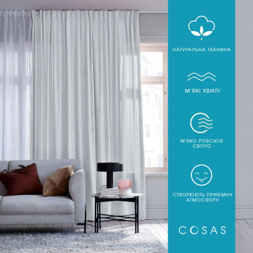 Розмір та склад "Комплект штор COSAS": штора COSAS 180х270см – 2 шт. Матеріал з якого виготовлені штори COSAS – 100% органічна бавовна, країна походження Туреччина має сертифікат якості Oeko-Tex. Штори COSAS добре пропускають свіже повітря, не блокують світло, в той же час добре поглинаючи сонячні промені, мають показник пропуску світла 50-75%. Однотонні штори COSAS підкреслять загальний стиль приміщення, візуально розширять вікно та збільшать висоту стелі. Ви можете комбінувати штори з іншими елементами декору , що додасть приміщенню неповторного завершеного стилю. При виборі кольору штор необхідно враховувати, на який бік виходять вікна. Якщо вікна виходять на південну сторону, краще вибирати холодні спокійні кольори штор, щоб компенсувати надлишок світла, а якщо на західну та північну підійдуть теплі тони. Комплект штор COSAS складається із 2 штор. Штори мають тасьму з петлями для фіксації та рівномірного складання. Створіть стильне приміщення із текстилем COSAS! Комплект штор упакований у фірмову картонну коробку, що також підійде на подарунок. Комплект штор COSAS стане лаконічним доповненням до декору вашого будинку.
